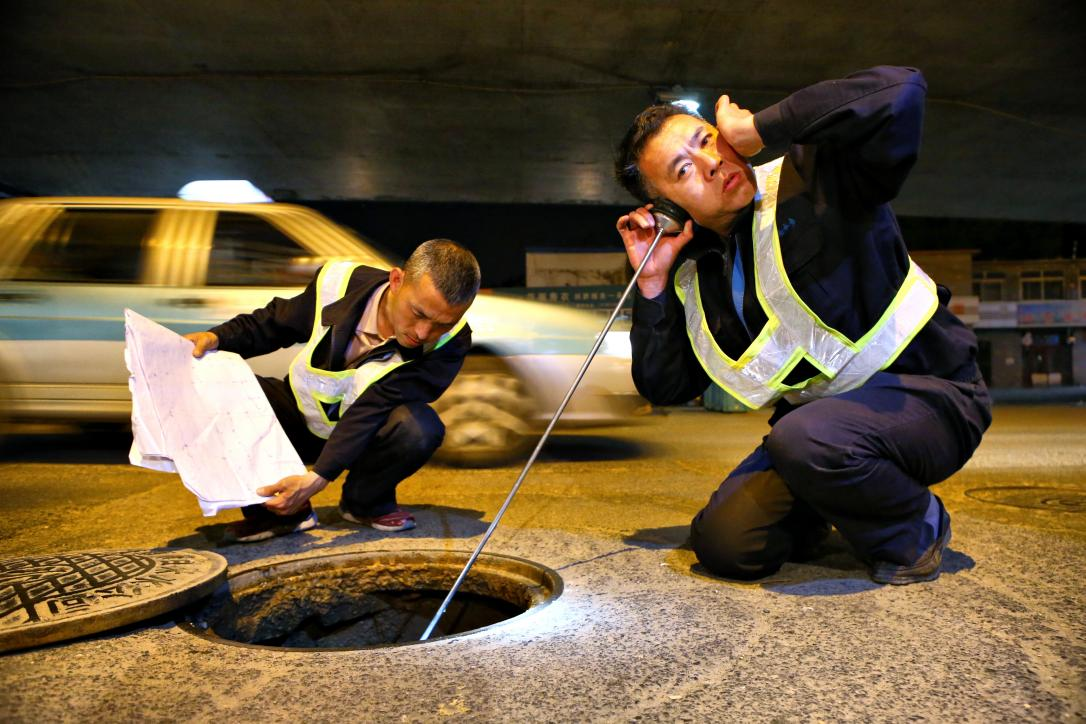 管網(wǎng)檢漏,是降低產(chǎn)銷(xiāo)差的有效措施。圖為檢漏員在疑似漏點(diǎn)周?chē)拿恳惶幘w仔細(xì)探聽(tīng)