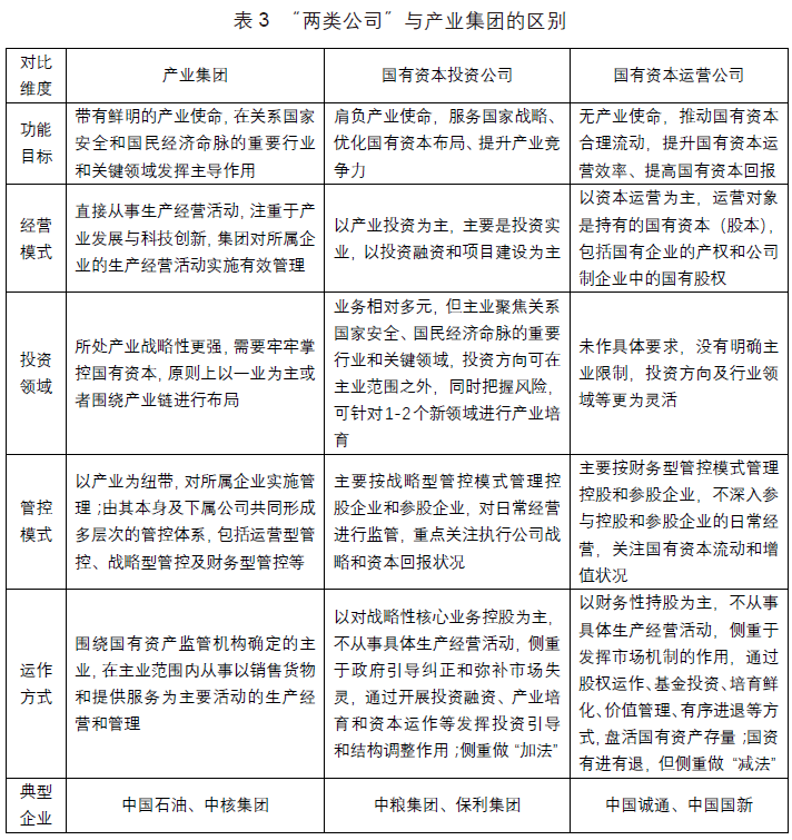 具體而言,“兩類公司”與產業集團在功能目標、經營模式、投資領域、管控模式、運作方式等方面存在著區別(見表3)。