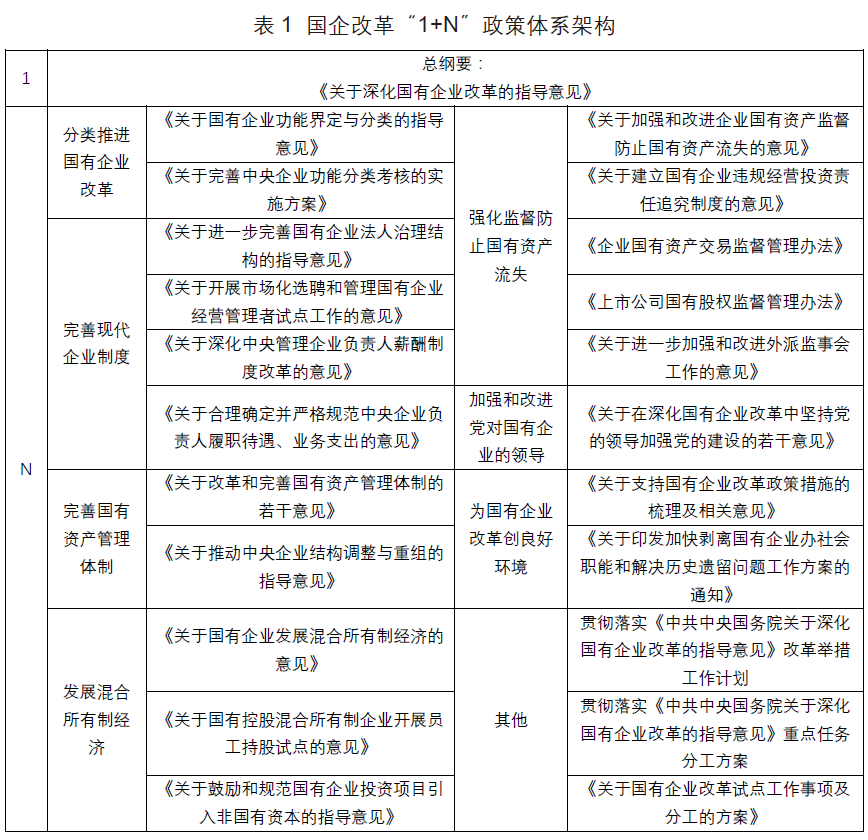 黨的十八大提出全面深化市場經濟體制改革,完善各類國有資產管理體制。黨的十八屆三中全會通過的《關于全面深化改革若干重大問題的決定》首次提出“國有資本投資、運營公司”概念,為國有資產管理體制改革定下“管資本”導向。2015年,黨中央、國務院印發綱領性文件《關于深化國有企業改革的指導意見》,并在隨后出臺了22個配套文件,從總體要求到分類改革、完善現代企業制度和國資管理體制、發展混合所有制經濟、強化監督防止國有資產流失等方面,提出了國企改革的目標和舉措,形成了“1+N”系列指導方案,為新時代國企改革搭建了“四梁八柱”(見表1)。