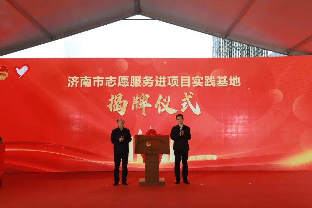 活動中,賈文、孫文國共同為濟南市志愿服務進項目實踐基地揭牌;出席活動領導同志共同為工友代表發放慰問品與“小桔燈”愛心公益書籍,向參加活動志愿者組織代表頒發公益合伙人證書并向各青年志愿服務隊授旗。