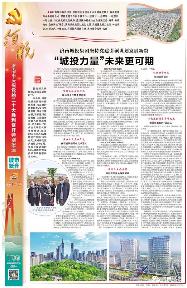 近年來,濟南城投集團始終圍繞市委、市政府的決策部署,堅持黨建引領,深化改革創新,積極履行社會責任,主動服務和融入新發展格局,助力新時代社會主義現代化強省會建設。截至2022年9月末,集團資產總額1960億元,完成固定資產投資208億元,完成年度計劃的85%,連續17年保持項下債務履約率100%。